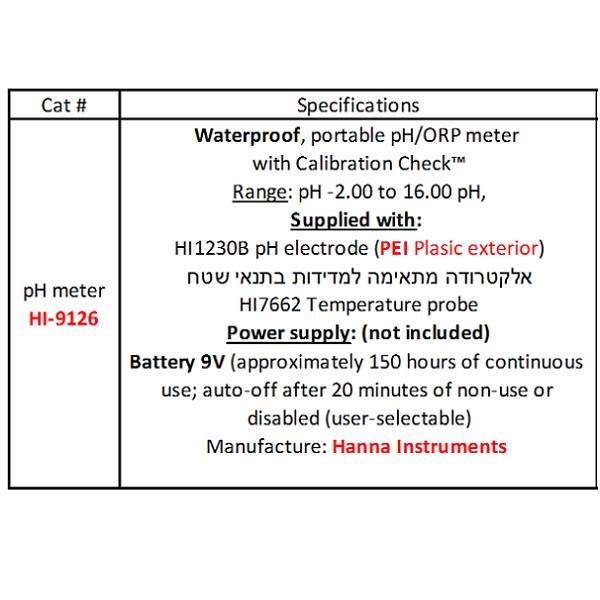 מודל:pH meter mobile ניידיצרן:Hanna Instruments USAמק"ט:HI-9126מצב:new